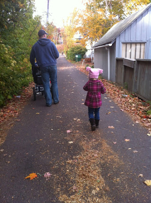 We've been enjoying fall around here! It has certainly turned cooler and the leaves are letting go of their branches. (It even snowed last week, but we'll pretend that didn't happen. At least it didn't stick.) Ella helped me make apple decorations for the mantle and we collected leaves for a leaf garland to hang on the mirror above it.